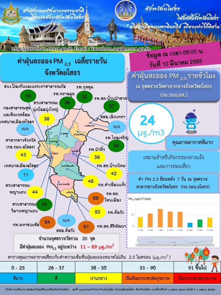 วันที่ 10 มี.ค. 2565 (16:55 น.)รายงานผลการตรวจวัดฝุ่นละอองขนาดไม่เกิน 2.5 ไมครอน ประจำวันที่ 10 มีนาคม 2565