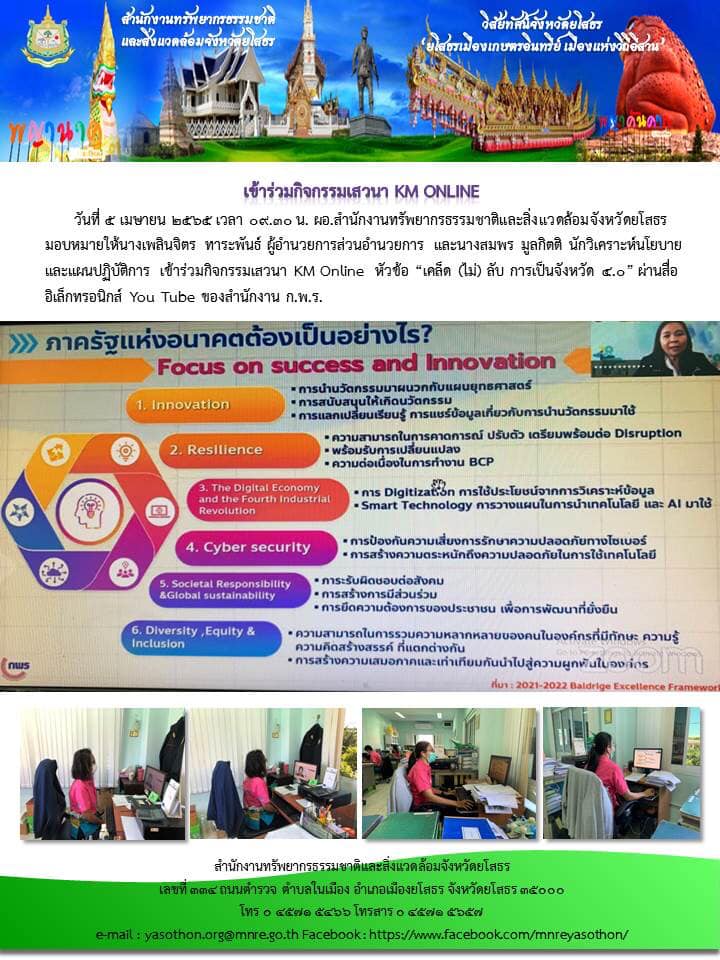 ผอ.สำนักงานทรัพยากรธรรมชาติและสิ่งแวดล้อมจังหวัดยโสธร มอบหมายให้นางเพลินจิตร ทาระพันธ์ ผู้อำนวยการส่วนอำนวยการ และนางสมพร มูลกิตติ นักวิเคราะห์นโยบายและแผนปฏิบัติการ เข้าร่วมกิจกรรมเสวนา KM Online หัวข้อ “เคล็ด (ไม่) ลับ การเป็นจังหวัด 4.0” ผ่านสื่ออิเล็กทรอนิกส์ You Tube ของสำนักงาน ก.พ.ร.