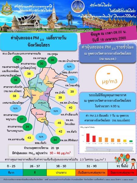 วันที่ 22 เม.ย. 2565 (16:47 น.)รายงานผลการตรวจวัดฝุ่นละอองขนาดไม่เกิน 2.5 ไมครอน ประจำวันที่ 18 เมษายน 2565