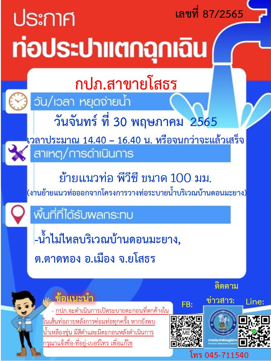 กปภ.สาขายโสธร ประกาศหยุดจ่ายน้ำเนื่องจากท่อแตกฉุกเฉิน วันจันทร์ ที่ 30 พฤษภาคม 2565 เวลาประมาณ 14.40 - 16.40 น. หรือจนกว่าจะแล้วเสร็จ