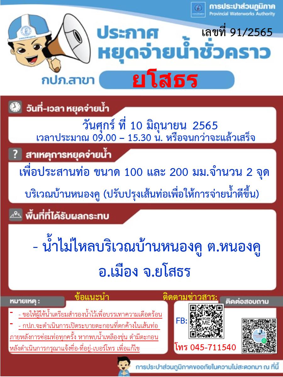 กปภ.สาขายโสธร ประกาศหยุดจ่ายน้ำเนื่องจากหยุดจ่ายน้ำชั่วคราว วันศุกร์ ที่ 10 มิถุนายน 2565 เวลาประมาณ 09.00 - 15.30 น. หรือจนกว่าจะแล้วเสร็จ