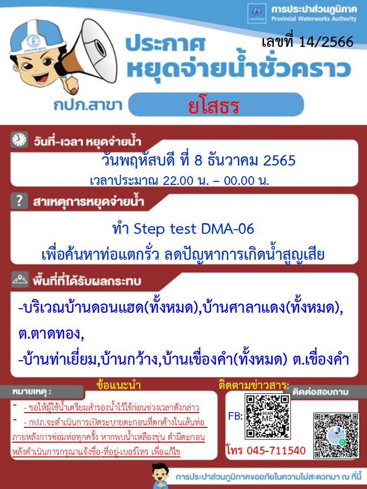 กปภ.สาขายโสธร ประกาศหยุดจ่ายน้ำเนื่องจากหยุดจ่ายน้ำชั่วคราว วันพฤหัสบดี ที่ 8 ธันวาคม 2565 เวลาประมาณ 22.00-00.00 น. หรือจนกว่าจะแล้วเสร็จ