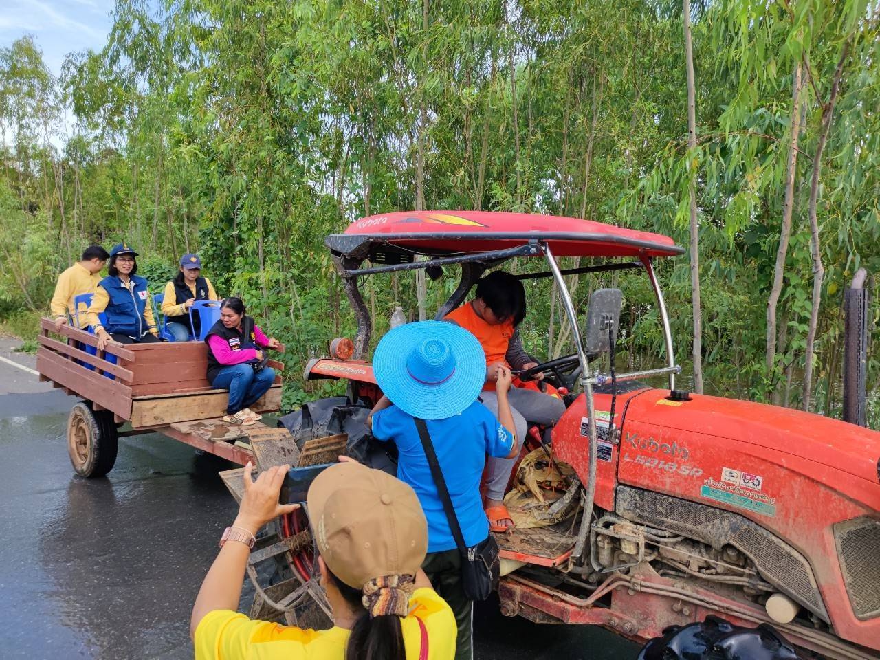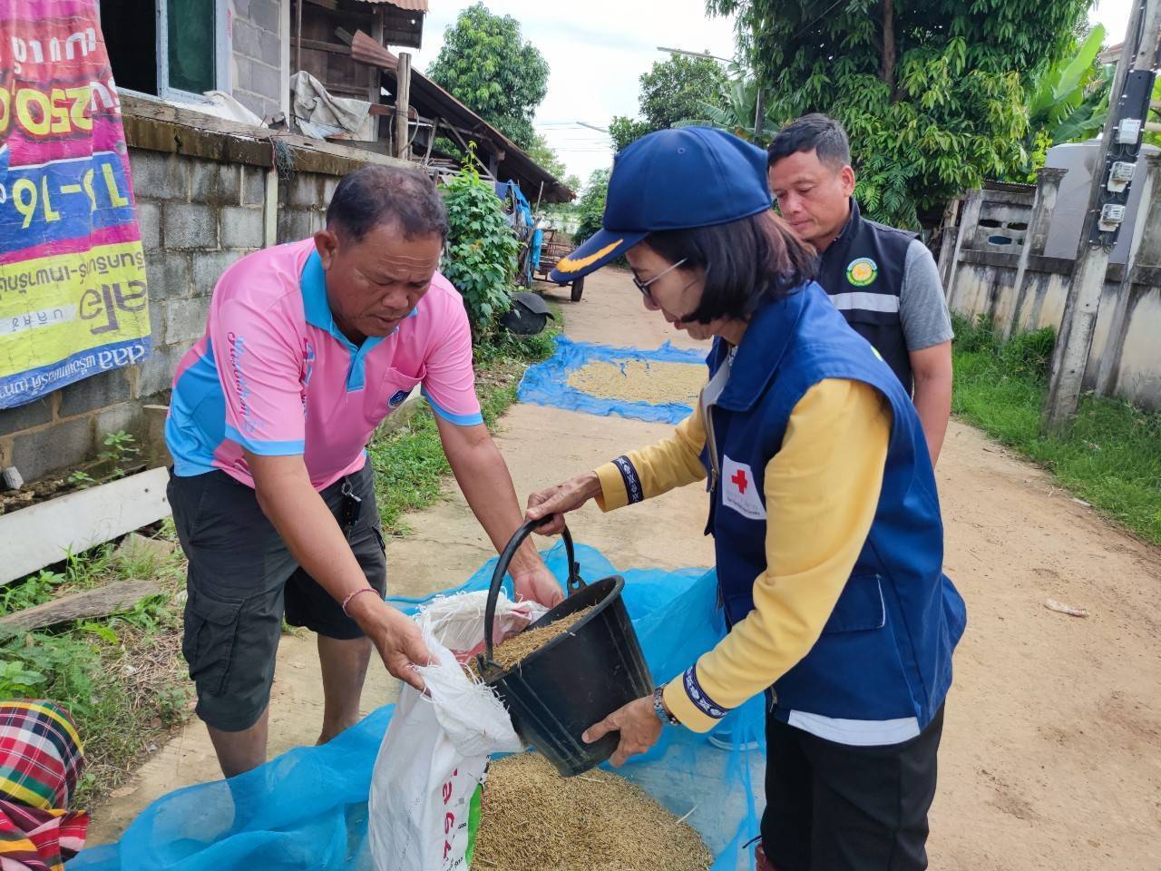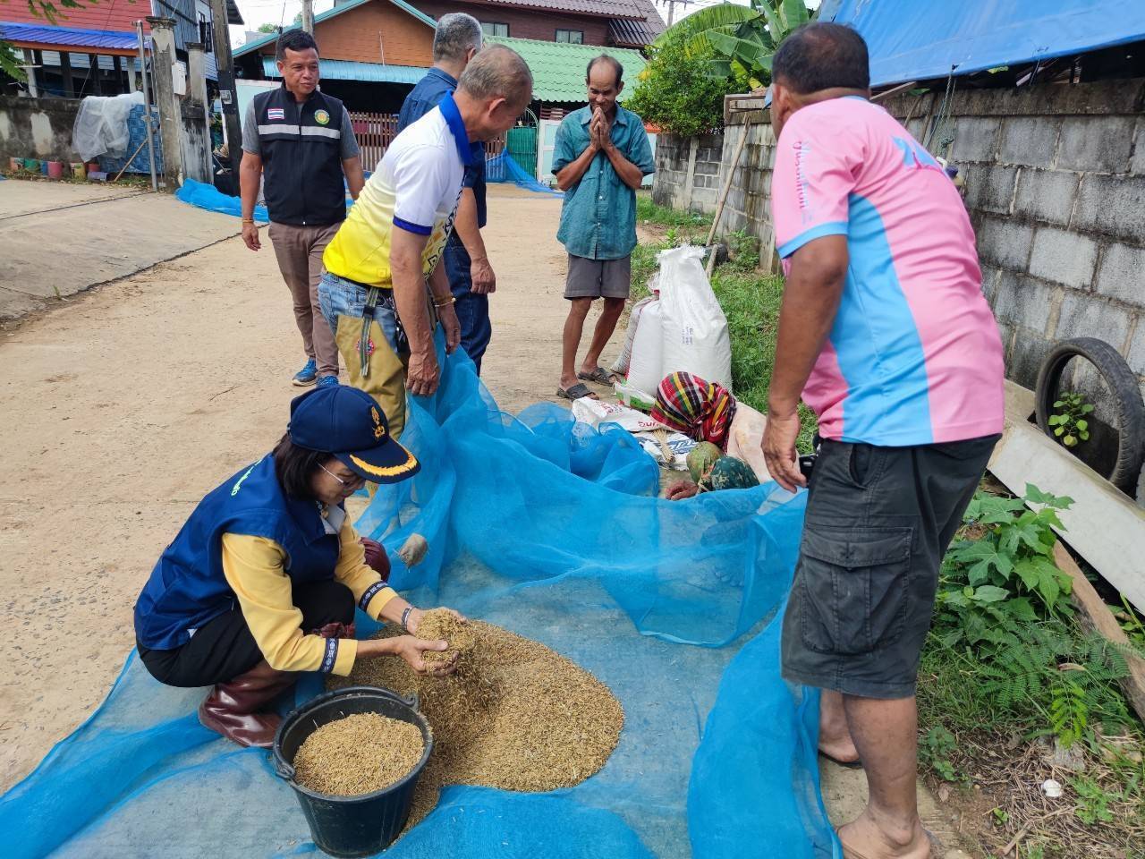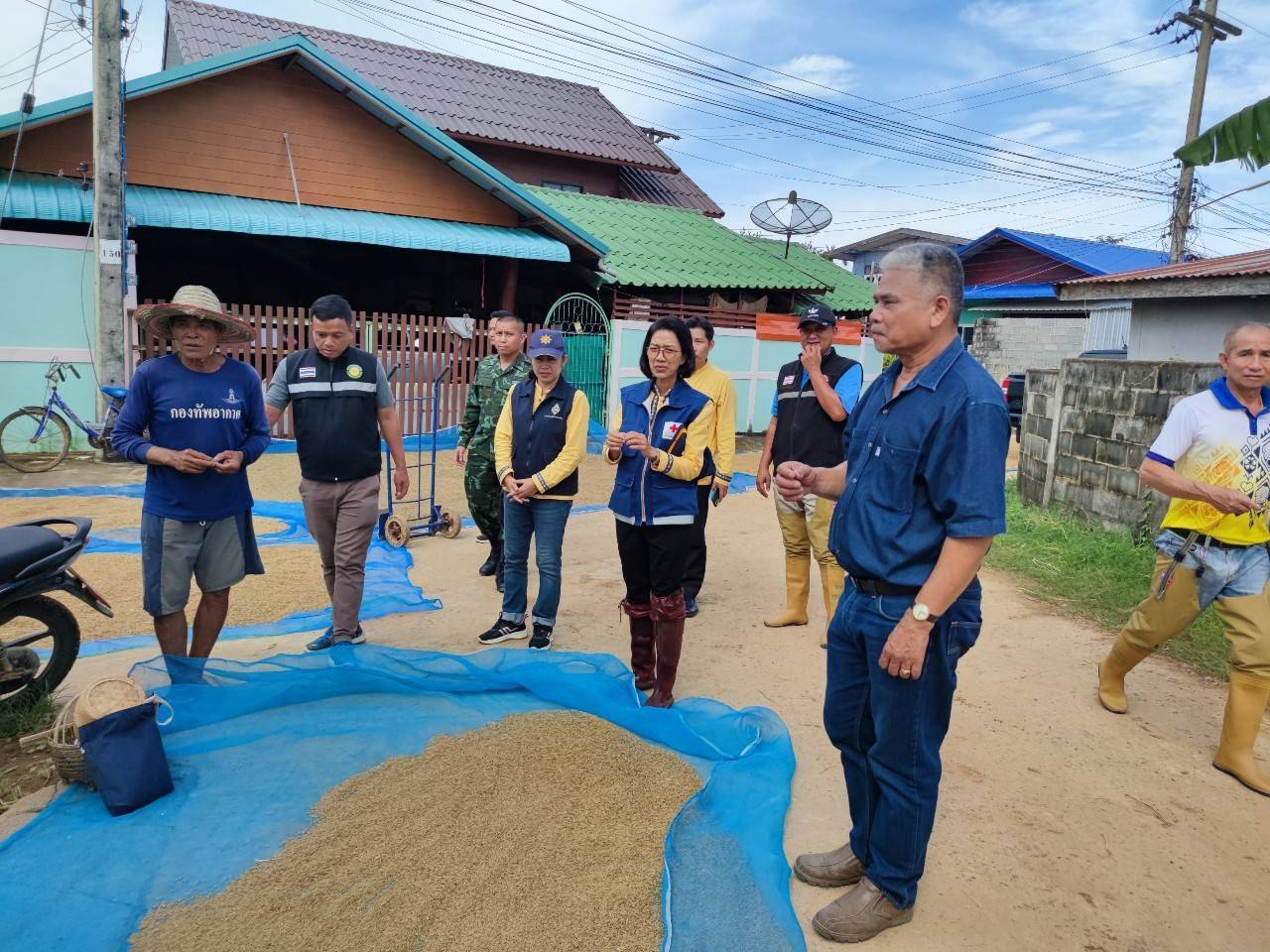 ในการนี้ ได้เยี่ยมเกษตรกรที่นำข้าวเปลือกจากการทำนาปรังที่รีบเก็บเกี่ยวจากนาน้ำท่วมมาผึ่งตากแดดเพื่อนำไปขายและเก็บไว้เป็นเมล็ดพันธ์ุข้าวปลูกด้วย