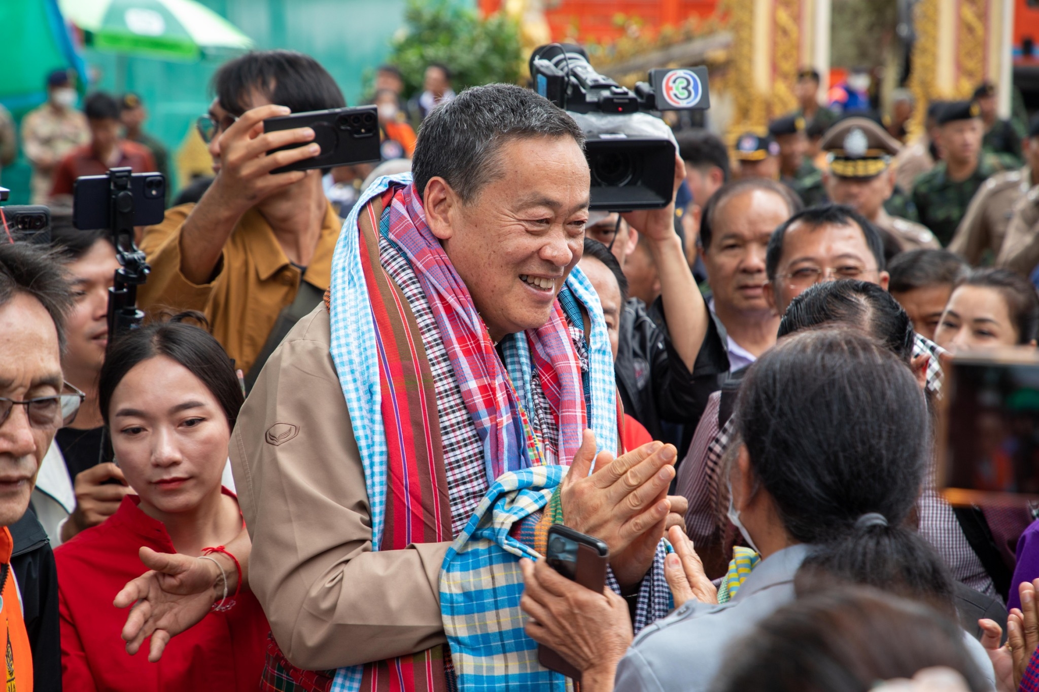 โดยมี ประชาชนรอต้อนรับผูกผ้าขาวม้าให้กำลังใจ จากนั้นนายกรัฐมนตรีได้กราบนมัสการพระครูเมธีธรรมบัญฑิต เจ้าคณะอำเภอคำเขื่อนแก้ว พร้อมถวายผ้าไตร และจตุปัจจัยไทยธรรม ในการนี้ ท่านเจ้าคณะอำเภอคำเขื่อนแก้วได้มอบพระพุทธบุษยรัตน์จำลอง ขนาดหน้าตัก5 นิ้ว พระคู่บ้านคู่เมืองจังหวัดยโสธร และได้ผูกข้อมือให้พรกับนายกรัฐมนตรีและรัฐมนตรีที่ร่วมคณะ ในครั้งนี้ด้วย