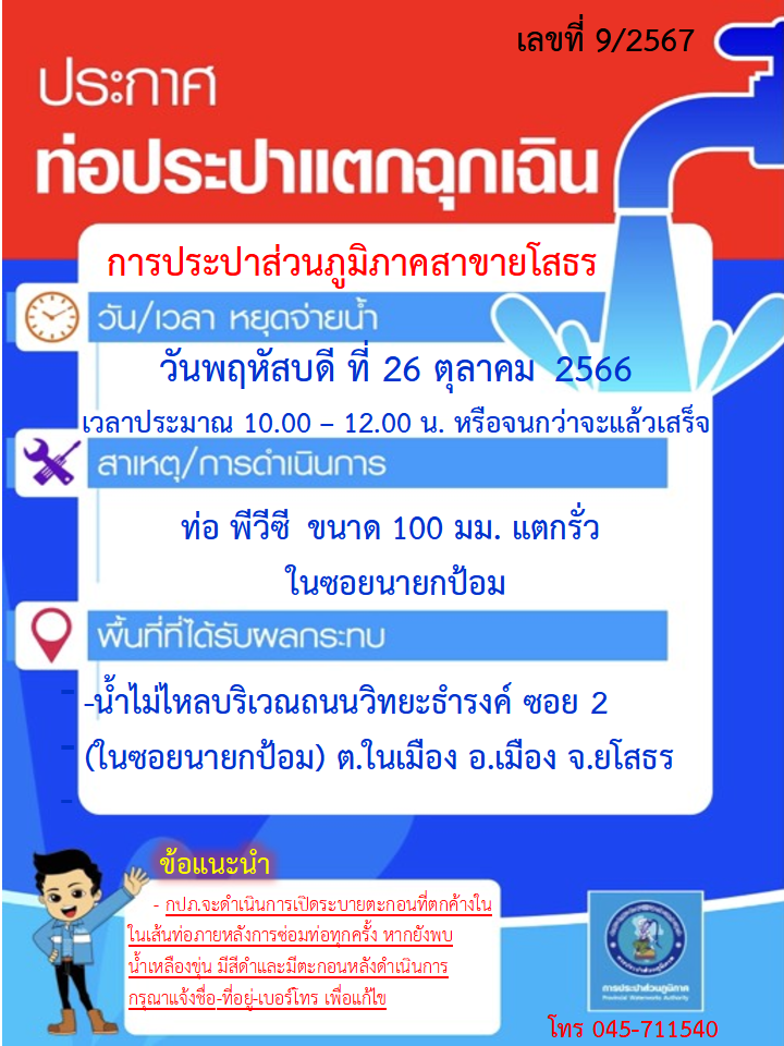กปภ.สาขายโสธร ประกาศหยุดจ่ายน้ำเนื่องจากท่อแตกฉุกเฉิน วันพฤหัสบดี ที่ 26 ตุลาคม 2566 เวลาประมาณ 10.00 - 12.00 น. หรือจนกว่าจะแล้วเสร็จ