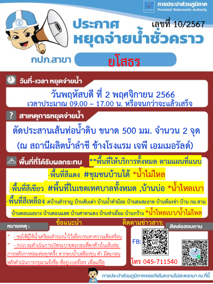 ผู้โพสต์ : [การประปาส่วนภูมิภาค สาขายโสธร] Hot news