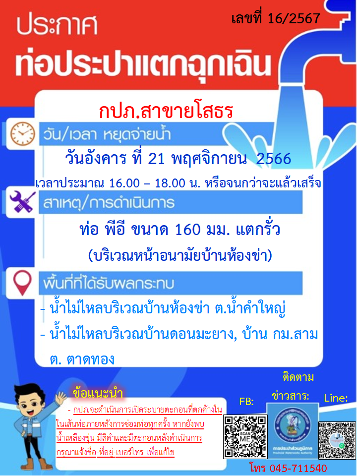 กปภ.สาขายโสธร ประกาศหยุดจ่ายน้ำเนื่องจากท่อแตกฉุกเฉิน วันอังคาร ที่ 21 พฤศจิกายน 2566 เวลาประมาณ 16.00 - 18.00 น. หรือจนกว่าจะแล้วเสร็จ