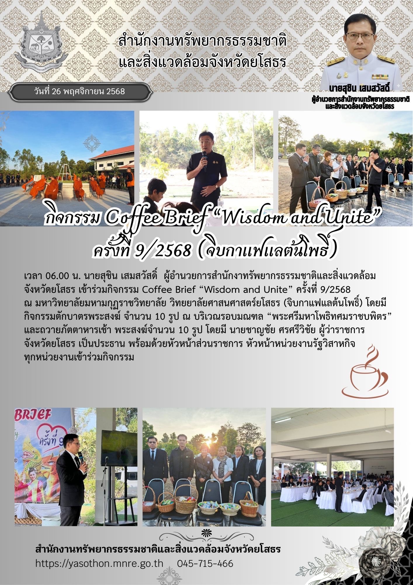 วันที่ 29 พ.ย. 2568 (12:05 น.)วันที่ 26 พฤศจิกายน 2568 เวลา 06.00 น. นายสุชิน เสมสวัสดิ์ ผู้อำนวยการสำนักงาทรัพยากรธรรมชาติและสิ่งแวดล้อมจังหวัดยโสธร เข้าร่วมกิจกรรม Coffee Brief “Wisdom and Unite” ครั้งที่ 9/2568 ณ มหาวิทยาลัยมหามกุฏราชวิทยาลัย วิทยยาลัยศาสนศาสตร์ยโสธร (จิบกาแฟแลต้นโพธิ์) โดยมีกิจกรรมตักบาตรพระสงฆ์ จำนวน 10 รูป ณ บริเวณรอบมณฑล “พระศรีมหาโพธิทศมราชบพิตร” และถวายภัตตาหารเช้า พระสงฆ์จำนวน 10 รูป โดยมี นายชาญชัย ศรศรีวิชัย ผู้ว่าราชการจังหวัดยโสธร เป็นประธาน พร้อมด้วยหัวหน้าส่วนราชการ หัวหน้าหน่วยงานรัฐวิสาหกิจทุกหน่วยงานเข้าร่วมกิจกรรม