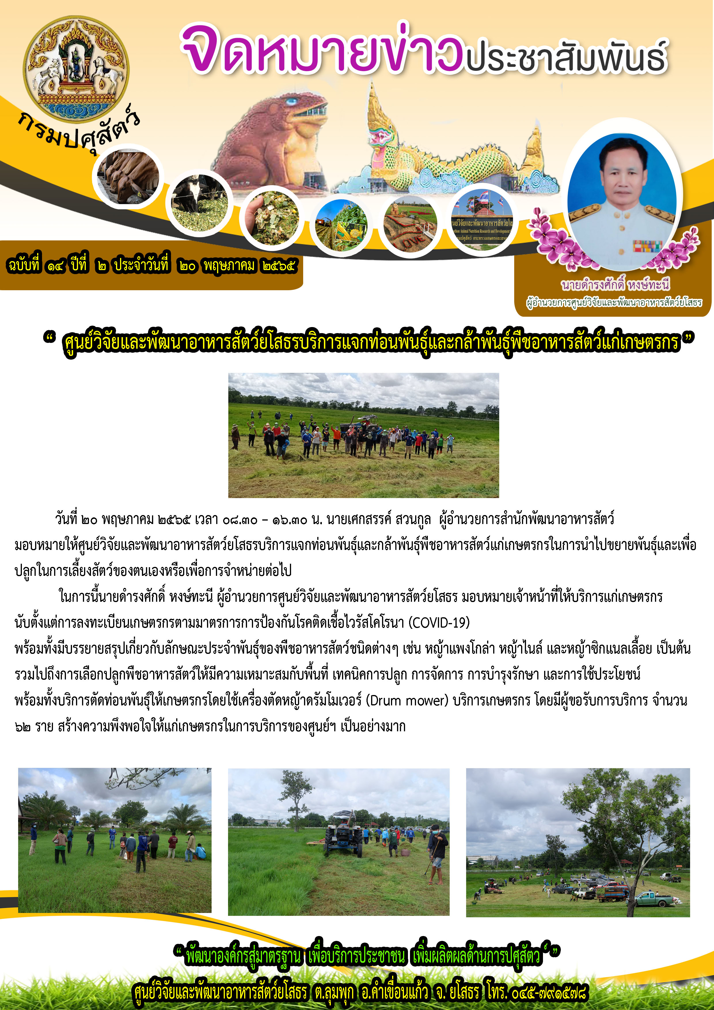 ???? นายเศกสรรค์ สวนกูล ผู้อำนวยการสำนักพัฒนาอาหารสัตว์ มอบหมายให้ศูนย์วิจัยและพัฒนาอาหารสัตว์ยโสธร บริการแจกท่อนพันธุ์และกล้าพันธุ์พืชอาหารสัตว์แก่เกษตรกรในการนำไปขยายพันธุ์และเพื่อปลูกในการเลี้ยงสัตว์ของตนเองหรือเพื่อการจำหน่ายต่อไป
