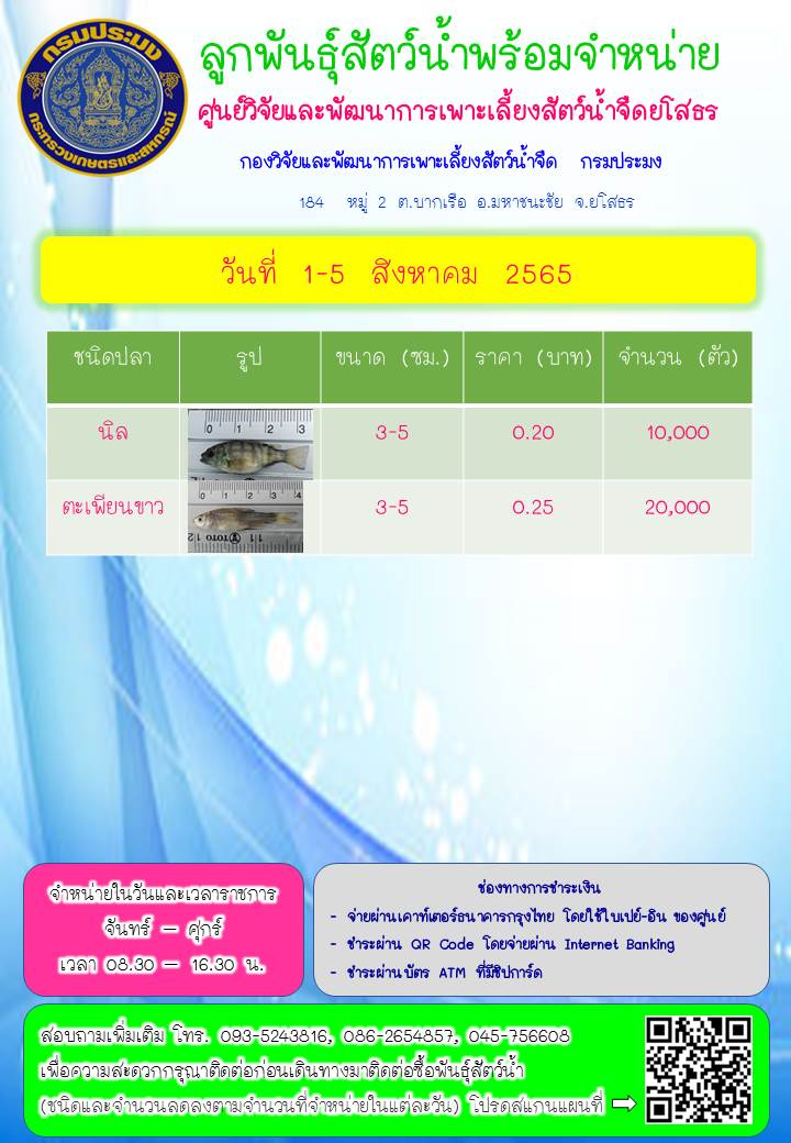ลูกพันธุ์สัตว์น้ำพร้อมจำหน่าย วันที่ 1 - 5 สิงหาคม 2565 ของศูนย์วิจัยและพัฒนาการเพาะเลี้ยงสัตว์น้ำจืดยโสธร