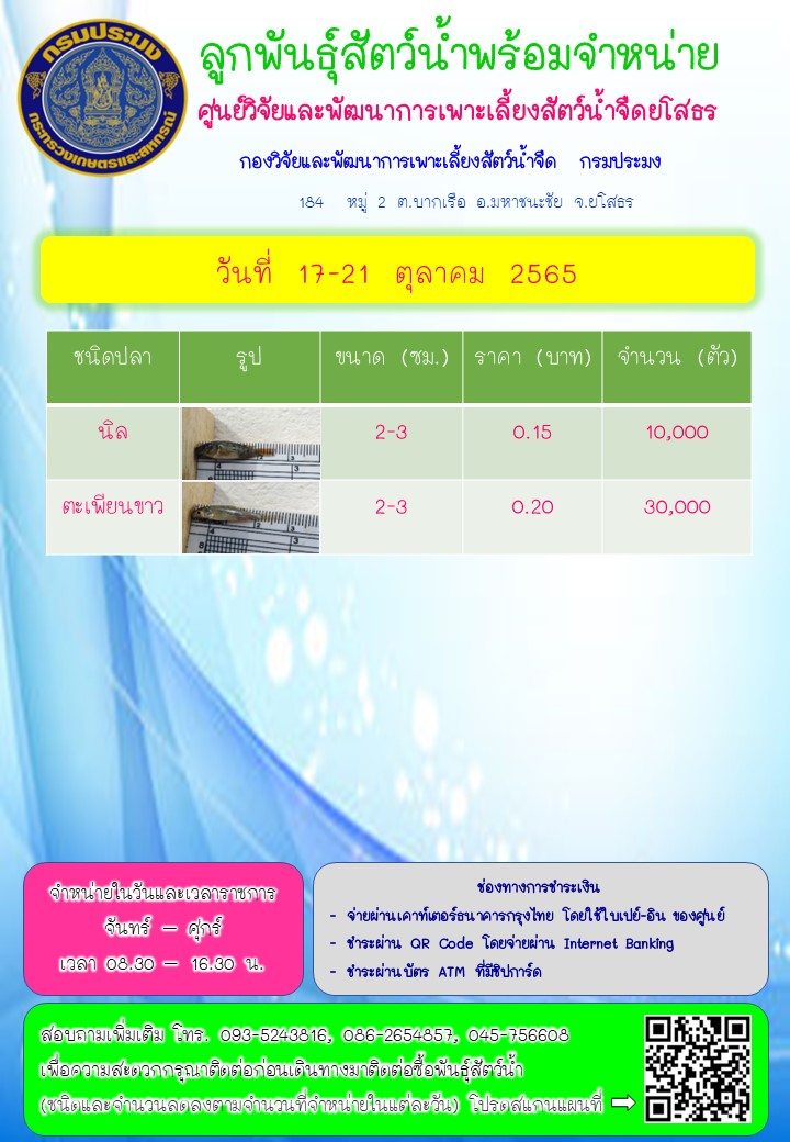 ลูกพันธุ์สัตว์น้ำพร้อมจำหน่าย วันที่ 17 - 21 ตุลาคม 2565 ของศูนย์วิจัยและพัฒนาการเพาะเลี้ยงสัตว์น้ำจืดยโสธร