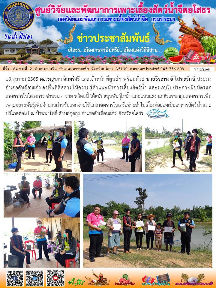 ผอ.ชญาภา จันทร์ศรี และเจ้าหน้าที่ศพจ.ยโสธร พร้อมประมงอำเถอคำเขื่อนแก้ว ลงพื้นที่ติดตามให้ความรู้คำแนะนำการเลี้ยงสัตว์น้ำและมอบใบประกาศนียบัตรแก่เกษตรกรในโครงการ พร้อมสนับสนุนพันธุ์ไข่น้ำและแหนแดง ณ บ้านนาโพธิ์ ต.กุดกง อ.คำเขื่อนแก้ว จ.ยโสธร