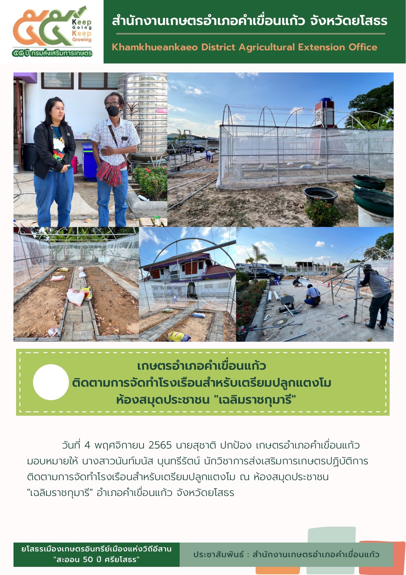 เกษตรอำเภอคำเขื่อนแก้ว ติดตามการจัดทำโรงเรือนสำหรับการเตรียมปลูกแตงโม