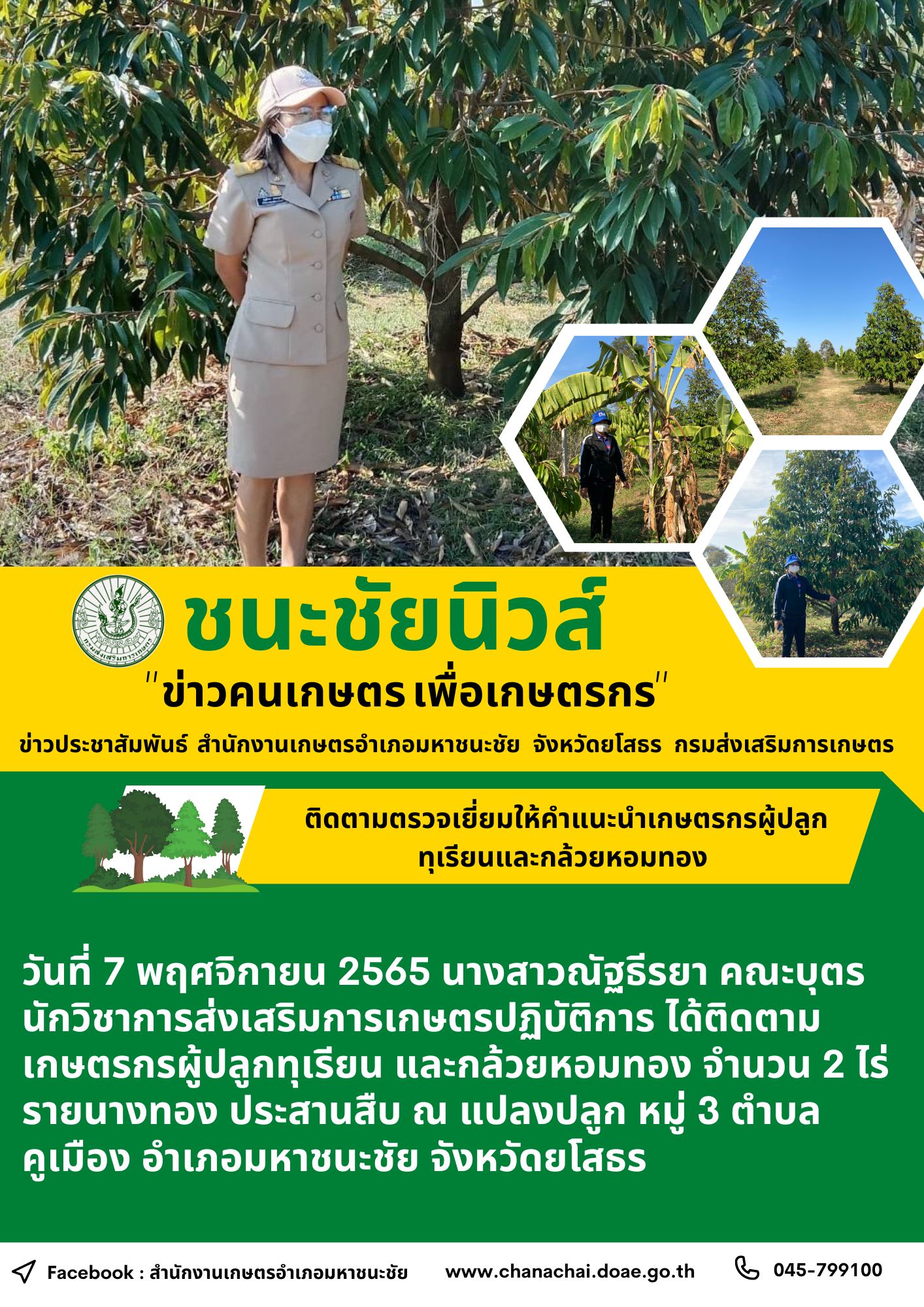 เกษตรอำเภอมหาชนะชัย ติดตามเยี่ยมให้คำแนะนำเกษตรกร ผู้ปลูกทุเรียนและกล้วยหอมทอง