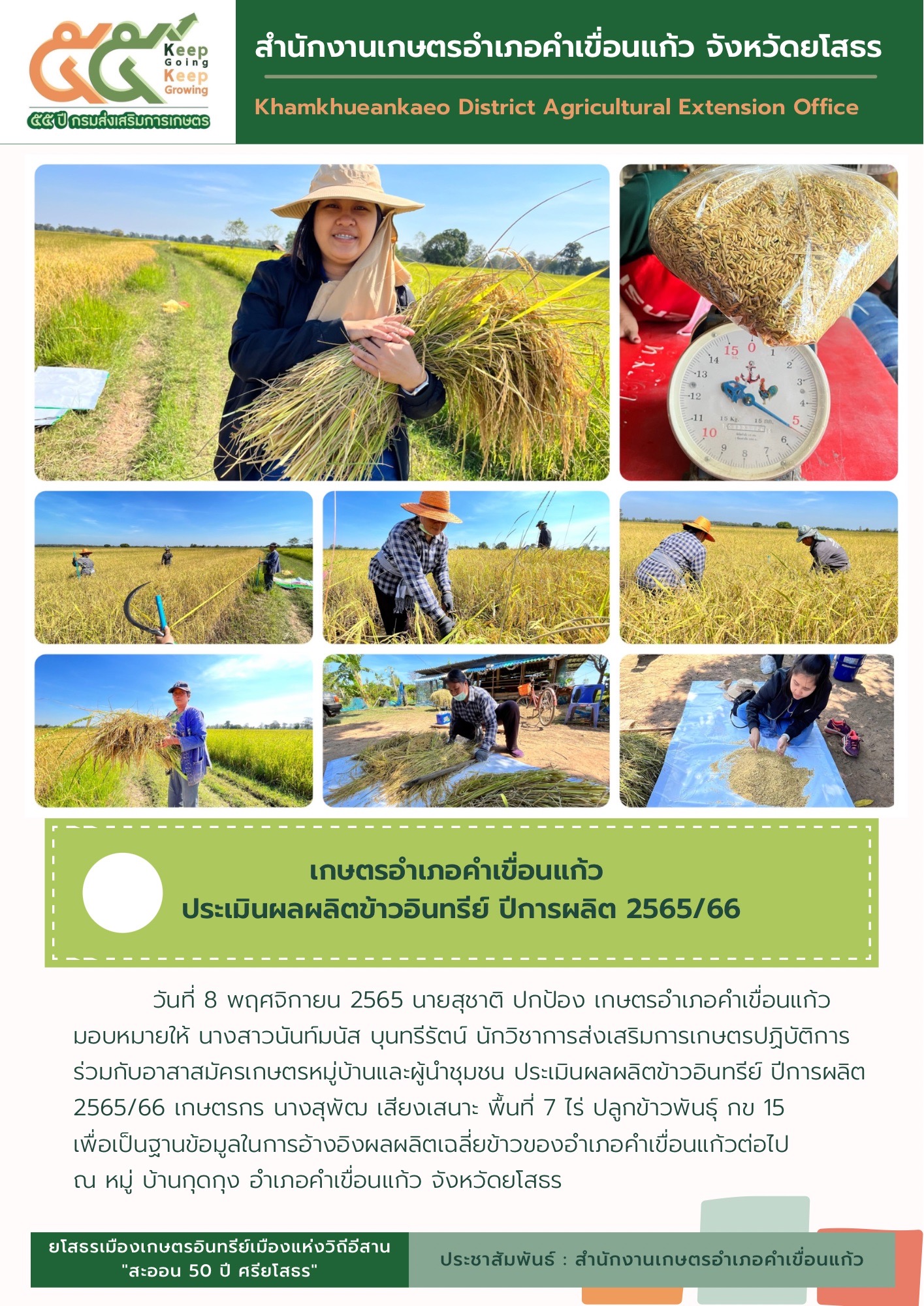 เกษตรอำเภอคำเขื่อนแก้ว ลงพื้นที่ประเมินผลผลิตข้าวอินทรีย์ ปีการผลิต 2565/66