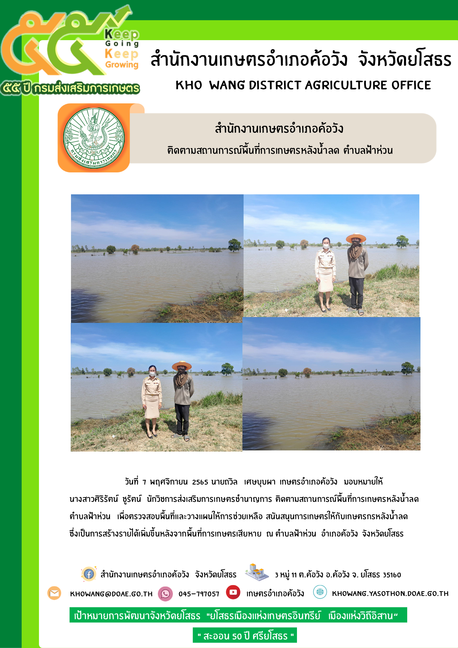 เกษตรอำเภอค้อวัง ติดตามสถานการพื้นที่การเกษตรหลังน้ำลด