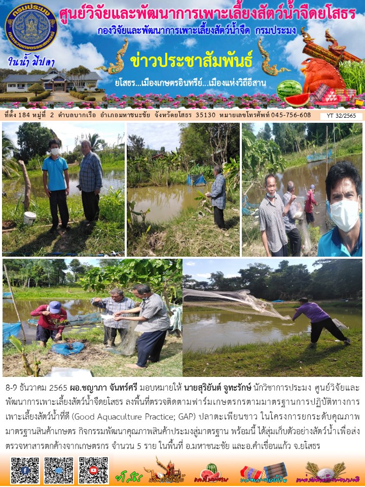 - [12:01] ทั่วไป เจ้าหน้าที่ศพจ.ยโสธร ร่วมกับปอ.คำเขื่อนแก้ว ลงพื้นที่ตรวจประเมินฟาร์มเกษตรกรที่ยื่นคำขอรับการรับรองตามมาตรฐานการปฏิบัติทางการเพาะเลี้ยงสัตว์น้ำที่ดีสำหรับฟาร์มเลี้ยงสัตว์น้ำเพื่อการบริโภค GAP มกษ. 7436-2563 ปลาตะเพียนขาว ในพื้นที่ อ.คำเขื่อนแก้ว