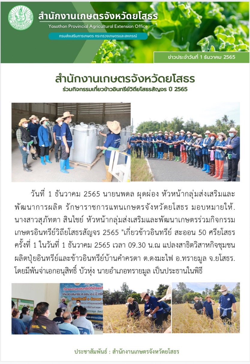 เกษตรจังหวัดยโสธร ร่วมกิจกรรมเกี่ยวข้าวอินทรีย์วิถียโสธร สัญจร ปี 2565