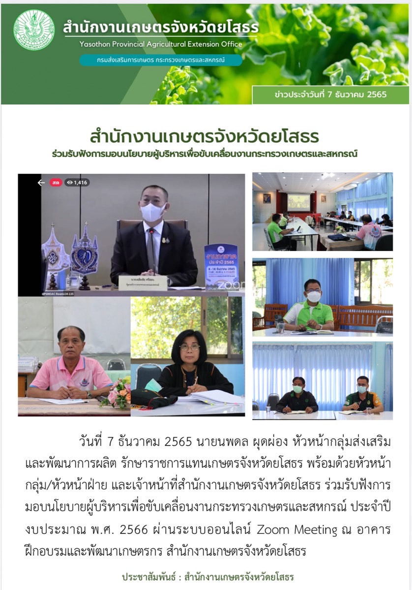 เกษตรจังหวัดยโสธร ร่วมรับฟังการมอบนโยบายผู้บริหารเพื่อขับเคลื่อนงานกระทรวงเกษตรและสหกรณ์