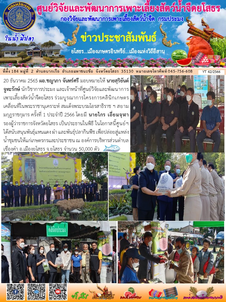 เจ้าหน้าที่ศูนย์วิจัยและพัฒนาการเพาะเลี้ยงสัตว์น้ำจืดยโสธร ร่วมบูรณาการโครงการคลินิกเกษตรเคลื่อนที่ในพระราชานุเคราะห์ สมเด็จพระบรมโอรสาธิราช ฯ สยามมกุฎราชกุมาร ครั้งที่ 1 ประจำปี 2566