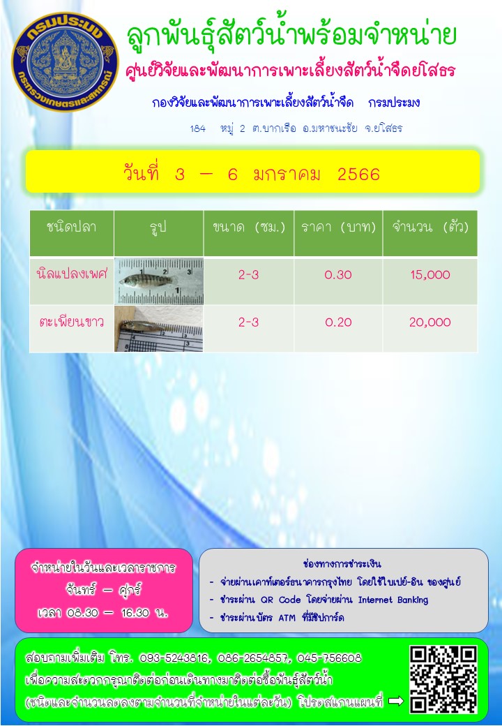 ลูกพันธุ์สัตว์น้ำพร้อมจำหน่าย วันที่ 3 - 6 มกราคม 2566 ของศูนย์วิจัยและพัฒนาการเพาะเลี้ยงสัตว์น้ำจืดยโสธร
