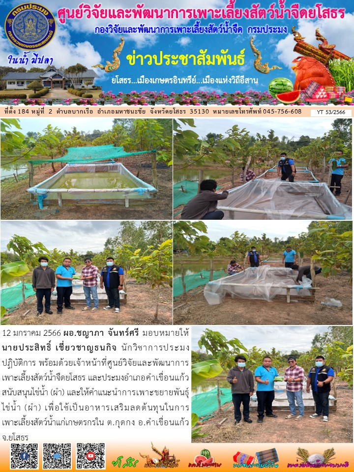 เจ้าหน้าที่ศูนย์วิจัยและพัฒนาการเพาะเลี้ยงสัตว์น้ำจืดยโสธร และประมงอำเภอคำเขื่อนแก้ว สนับสนุนไข่น้ำ (ผำ) และให้คำแนะนำการเพาะขยายพันธุ์ไข่น้ำ (ผำ) เพื่อใช้เป็นอาหารเสริมลดต้นทุนในการเพาะเลี้ยงสัตว์น้ำแก่เกษตรกรใน ต.กุดกง อ.คำเขื่อนแก้ว จ.ยโสธร