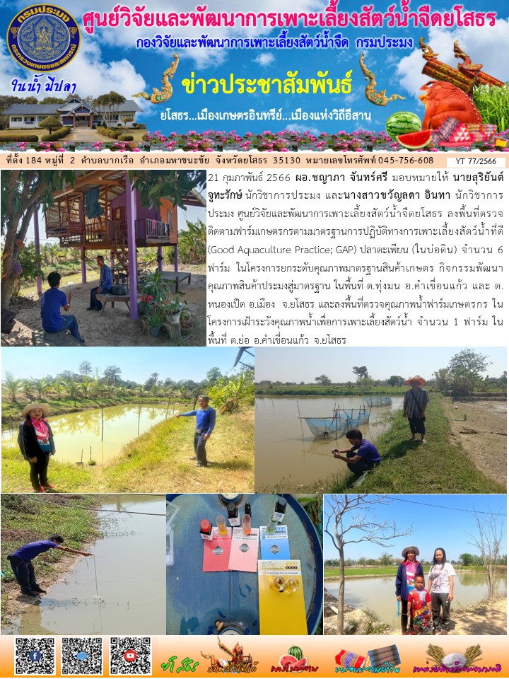 เจ้าหน้าที่ศูนย์วิจัยและพัฒนาการเพาะเลี้ยงสัตว์น้ำจืดยโสธร ลงพื้นที่ตรวจติดตามฟาร์มเกษตรกรตามมาตรฐานการปฏิบัติทางการเพาะเลี้ยงสัตว์น้ำที่ดี (Good Aquaculture Practice; GAP) ปลาตะเพียน และลงพื้นที่ตรวจคุณภาพน้ำฟาร์มเกษตรกร ในโครงการเฝ้าระวังคุณภาพน้ำ