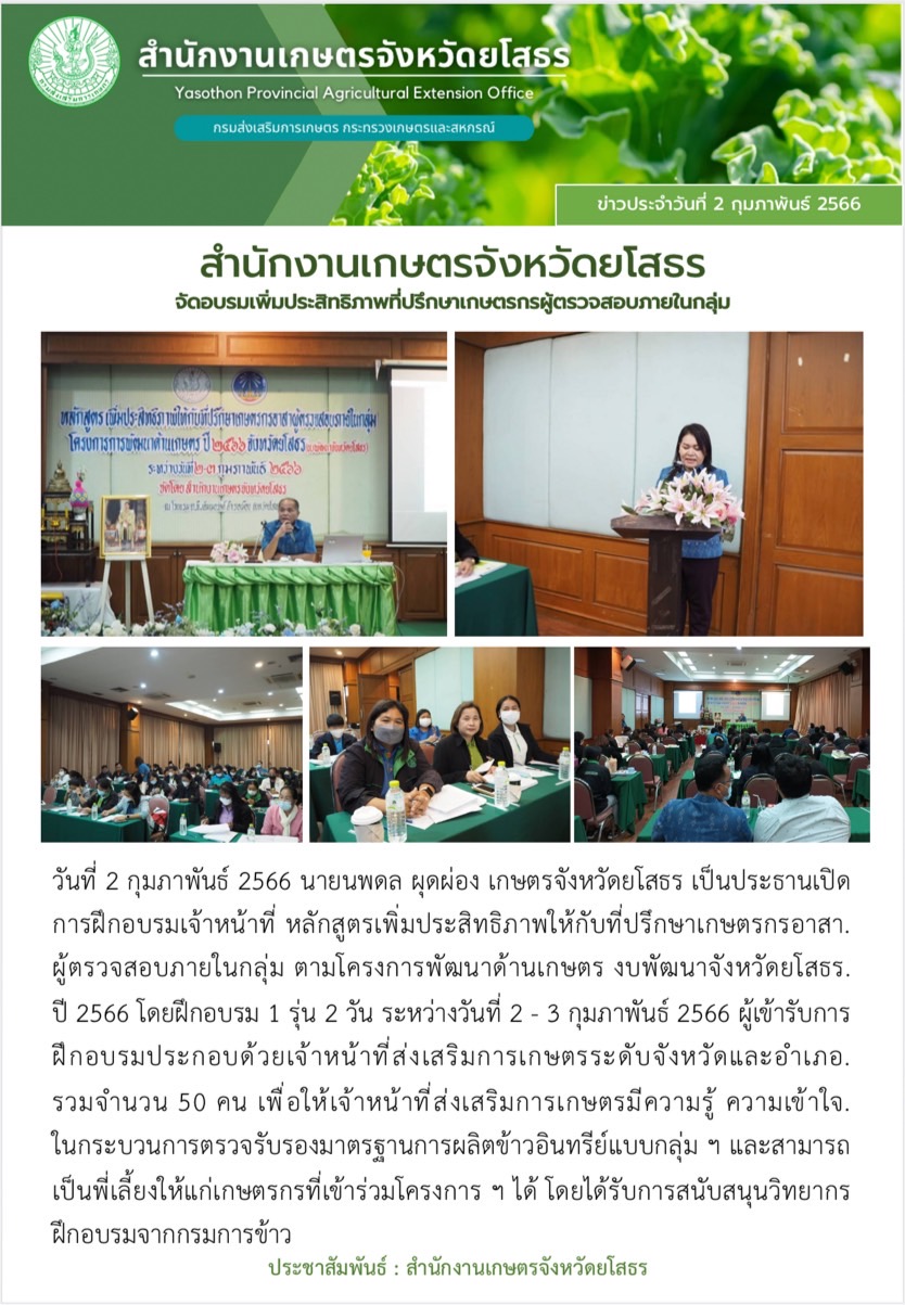 เกษตรจังหวัดยโสธร จัดอบรมเพิ่มประสิทธิภาพที่ปรึกษาเกษตรกรผู้ตรวจสอบภายในกลุ่ม