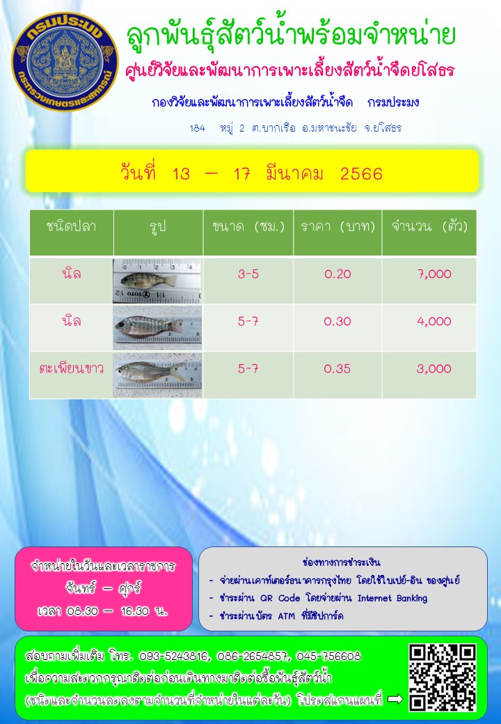ลูกพันธุ์สัตว์น้ำพร้อมจำหน่าย วันที่ 13 - 17 มีนาคม 2566 ของศูนย์วิจัยและพัฒนาการเพาะเลี้ยงสัตว์น้ำจืดยโสธร