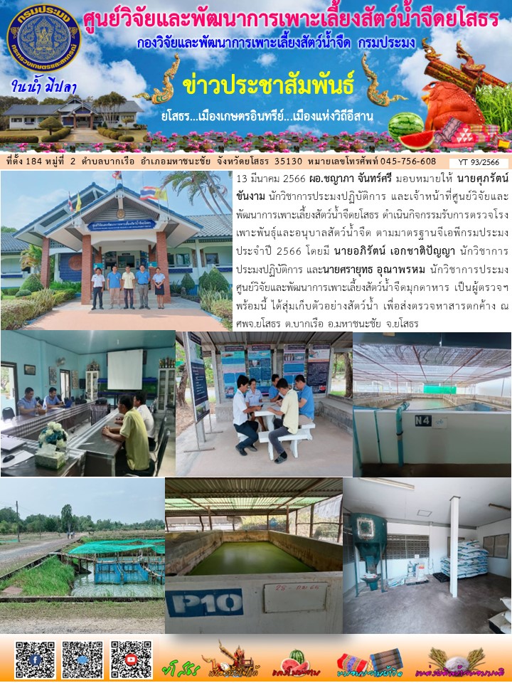 - [12:01] ทั่วไป เจ้าหน้าที่ศพจ.ยโสธร ร่วมกับปอ.คำเขื่อนแก้ว ลงพื้นที่ตรวจประเมินฟาร์มเกษตรกรที่ยื่นคำขอรับการรับรองตามมาตรฐานการปฏิบัติทางการเพาะเลี้ยงสัตว์น้ำที่ดีสำหรับฟาร์มเลี้ยงสัตว์น้ำเพื่อการบริโภค GAP มกษ. 7436-2563 ปลาตะเพียนขาว ในพื้นที่ อ.คำเขื่อนแก้ว
