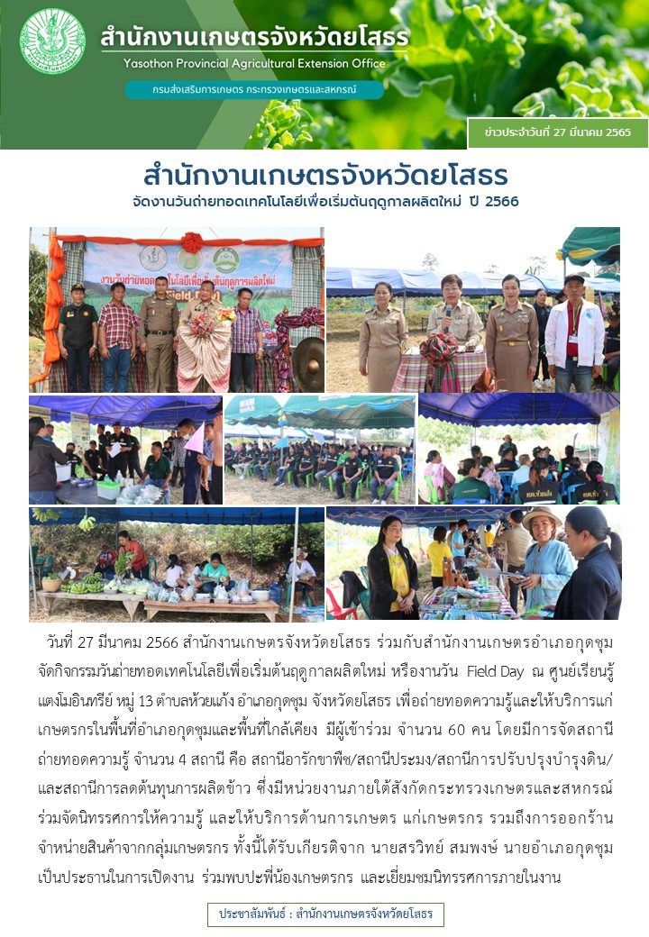 เกษตรจังหวัดยโสธร จัดงานวันถ่ายทอดเทคโนโลยีเพื่อเริ่มต้นฤดูกาลผลิตใหม่ ปี2566