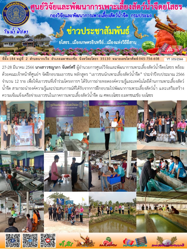 นางสาวชญาภา จันทร์ศรี ผู้อำนวยการศูนย์วิจัยและพัฒนาการเพาะเลี้ยงสัตว์น้ำจืดยโสธร พร้อมด้วยคณะเจ้าหน้าที่ศูนย์ฯ จัดฝึกอบรมเยาวชน หลักสูตร “เยาวชนนักเพาะเลี้ยงสัตว์น้ำจืด” ประจำปีงบประมาณ 2566 จำนวน 12 ราย