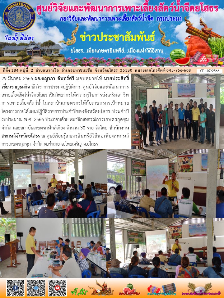 นายประสิทธิ์ เชี่ยวชาญธนกิจ นักวิชาการประมงปฏิบัติการ ศูนย์วิจัยและพัฒนาการเพาะเลี้ยงสัตว์น้ำจืดยโสธร เป็นวิทยากรให้ความรู้ในการส่งเสริมอาชีพการเพาะเลี้ยงสัตว์น้ำในสถาบันเกษตรกรให้กับเกษตรกรเป้าหมาย โครงการภายใต้แผนปฏิบัติราชการประจำปีของจังหวัดยโสธร