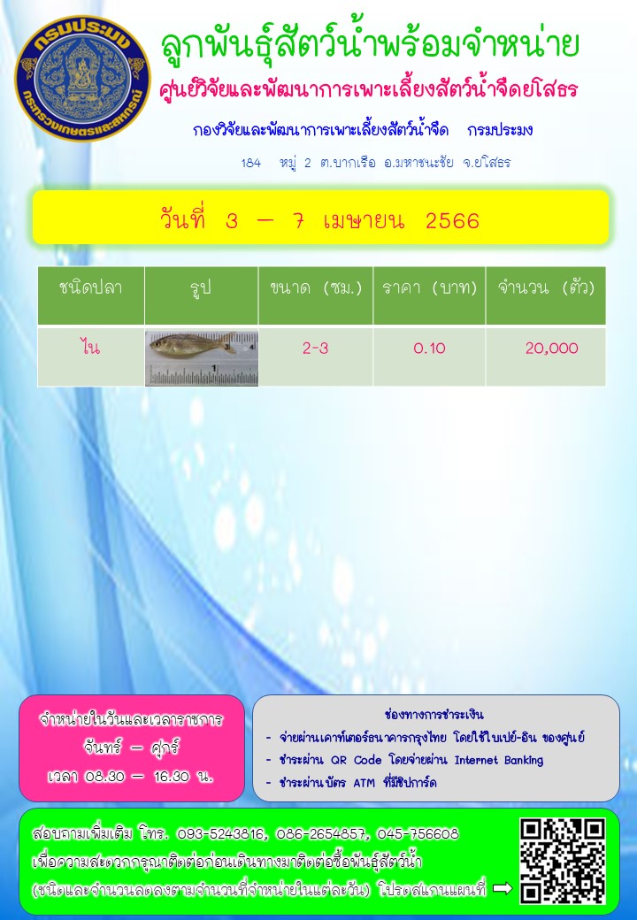 ลูกพันธุ์สัตว์น้ำพร้อมจำหน่าย วันที่ 3 - 7 เมษายน 2566 ของศูนย์วิจัยและพัฒนาการเพาะเลี้ยงสัตว์น้ำจืดยโสธร