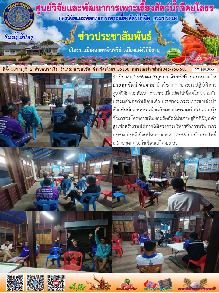 - [12:01] ทั่วไป เจ้าหน้าที่ศพจ.ยโสธร ร่วมกับปอ.คำเขื่อนแก้ว ลงพื้นที่ตรวจประเมินฟาร์มเกษตรกรที่ยื่นคำขอรับการรับรองตามมาตรฐานการปฏิบัติทางการเพาะเลี้ยงสัตว์น้ำที่ดีสำหรับฟาร์มเลี้ยงสัตว์น้ำเพื่อการบริโภค GAP มกษ. 7436-2563 ปลาตะเพียนขาว ในพื้นที่ อ.คำเขื่อนแก้ว