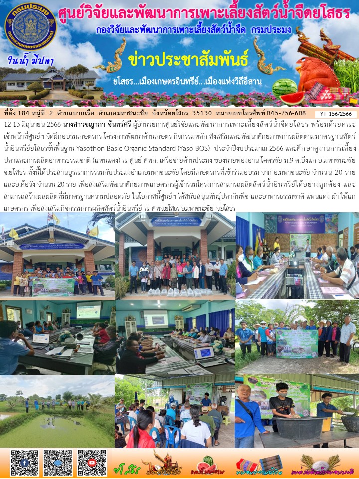- [12:01] ทั่วไป เจ้าหน้าที่ศพจ.ยโสธร ร่วมกับปอ.คำเขื่อนแก้ว ลงพื้นที่ตรวจประเมินฟาร์มเกษตรกรที่ยื่นคำขอรับการรับรองตามมาตรฐานการปฏิบัติทางการเพาะเลี้ยงสัตว์น้ำที่ดีสำหรับฟาร์มเลี้ยงสัตว์น้ำเพื่อการบริโภค GAP มกษ. 7436-2563 ปลาตะเพียนขาว ในพื้นที่ อ.คำเขื่อนแก้ว