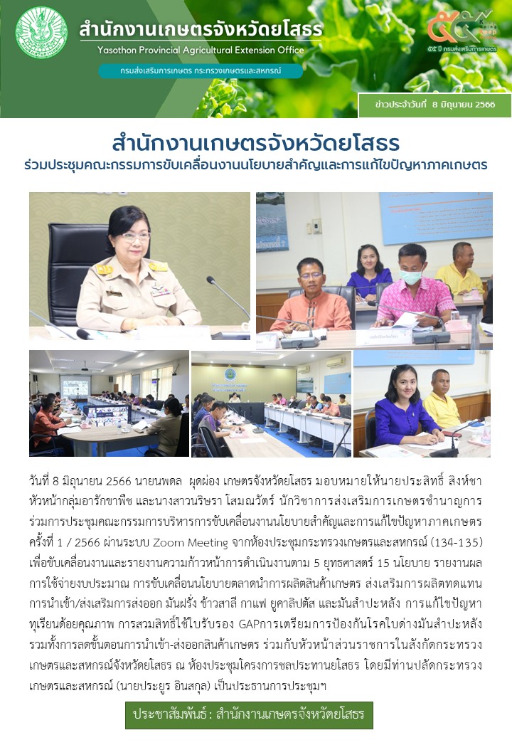 เกษตรจังหวัดยโสธร ร่วมประชุมคณะกรรมการขับเคลื่อนงานนโยบายสำคัญและการแก้ไขปัญหาภาคเกษตร