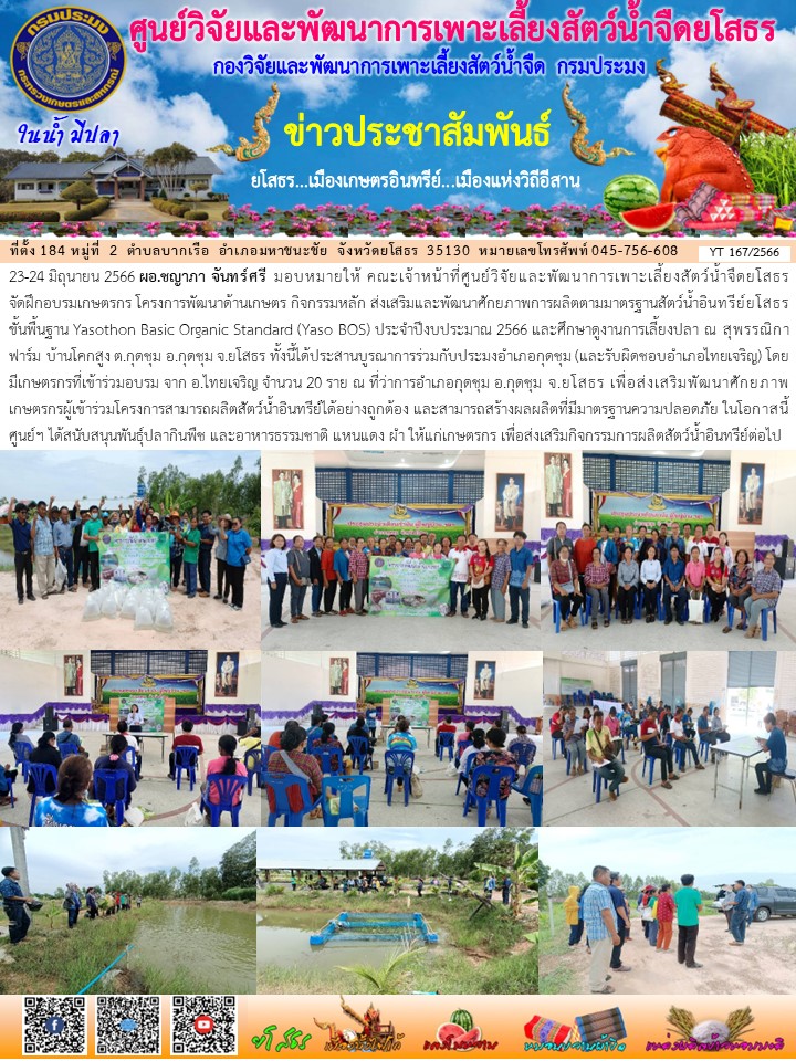 อบรมเกษตรกร ส่งเสริมและพัฒนาศักยภาพการผลิตตามมาตรฐานสัตว์น้ำอินทรีย์ยโสธรขั้นพื้นฐาน อ.ไทยเจริญ ประจำปีงบประมาณ 2566