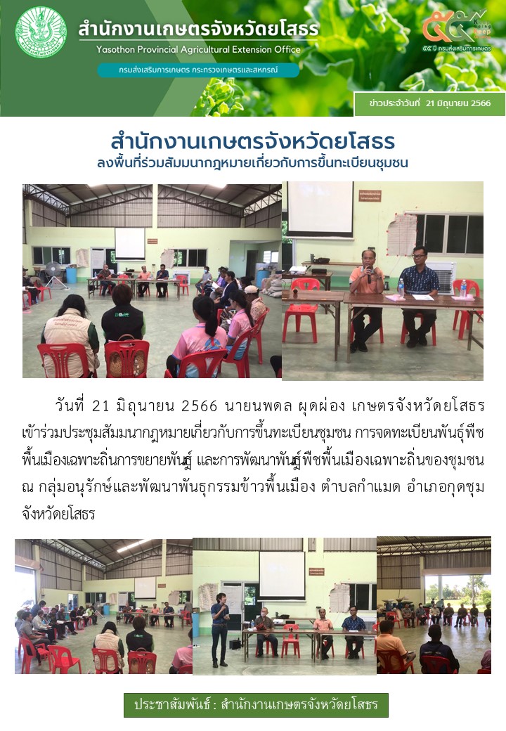 เกษตรจังหวัดยโสธร ลงพื้นที่ร่วมสัมมนากฎหมายเกี่ยวกับการขึ้นทะเบียนชุมชน
