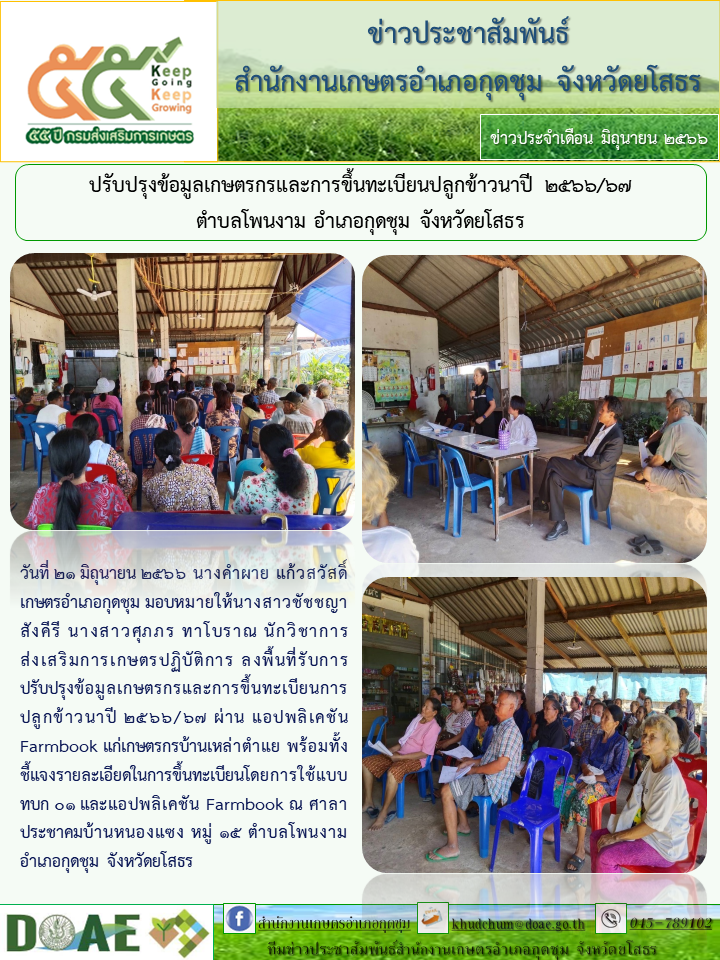 เกษตรอำเภอกุดชุม ลงพื้นที่ปรับปรุงข้อมูลเกษตรกรและการขึ้นทะเบียนปลูกข้าวนาปี 2566/67
