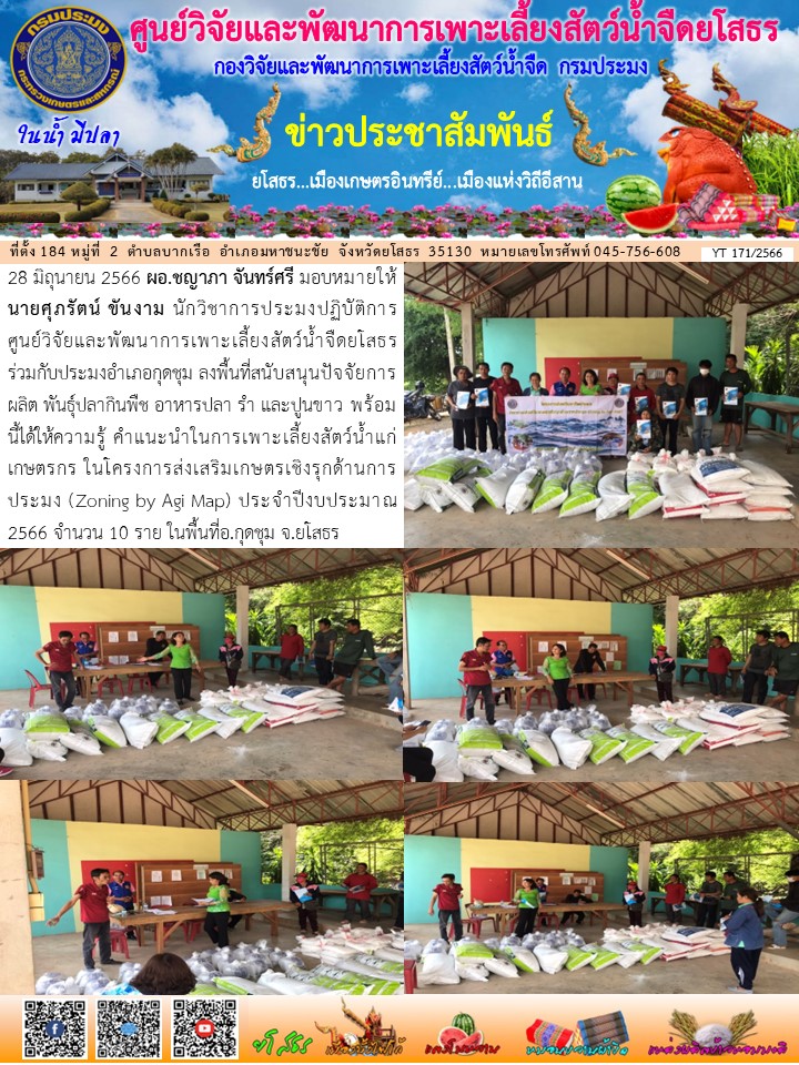 นายศุภรัตน์ ขันงาม นักวิชาการประมงปฏิบัติการ ศูนย์วิจัยและพัฒนาการเพาะเลี้ยงสัตว์น้ำจืดยโสธร ร่วมกับประมงอำเภอกุดชุม ลงพื้นที่สนับสนุนปัจจัยการผลิต ในโครงการส่งเสริมเกษตรเชิงรุกด้านการประมง (Zoning by Agi Map) จำนวน 10 ราย ในพื้นที่อ.กุดชุม จ.ยโสธร