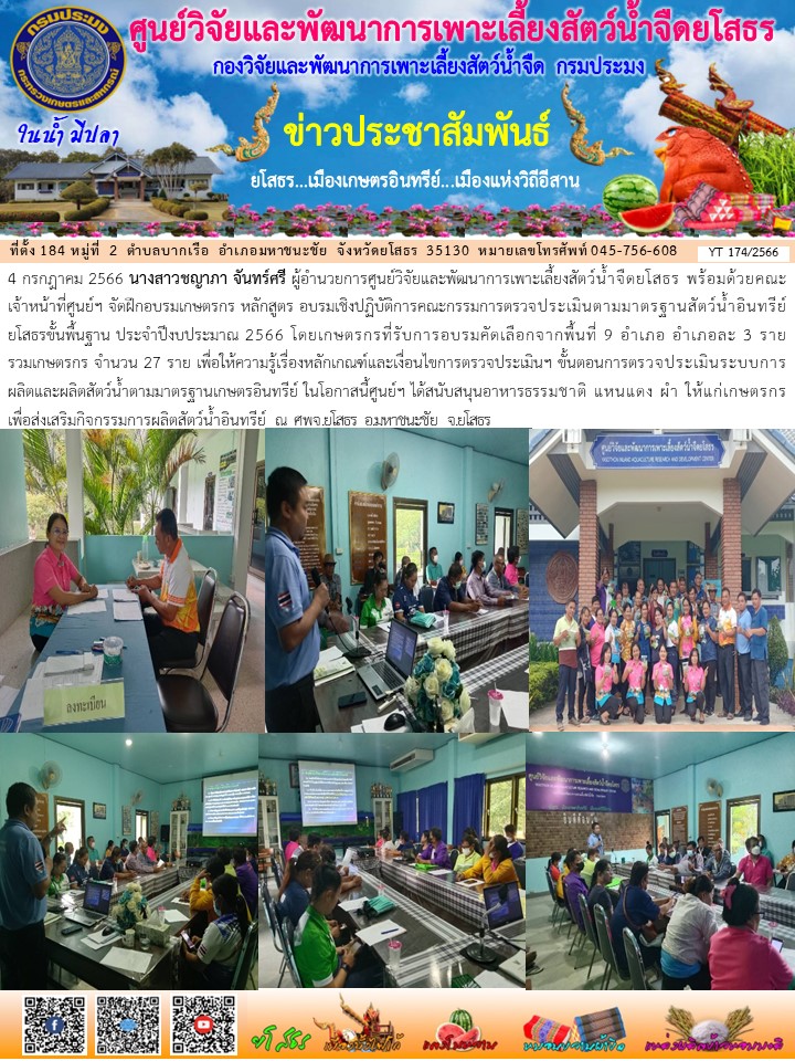 นางสาวชญาภา จันทร์ศรี ผู้อำนวยการศูนย์วิจัยและพัฒนาการเพาะเลี้ยงสัตว์น้ำจืดยโสธร พร้อมด้วยคณะเจ้าหน้าที่ศูนย์ฯ จัดฝึกอบรมเกษตรกร หลักสูตร อบรมเชิงปฏิบัติการคณะกรรมการตรวจประเมินตามมาตรฐานสัตว์น้ำอินทรีย์ยโสธรขั้นพื้นฐาน ประจำปีงบประมาณ 2566