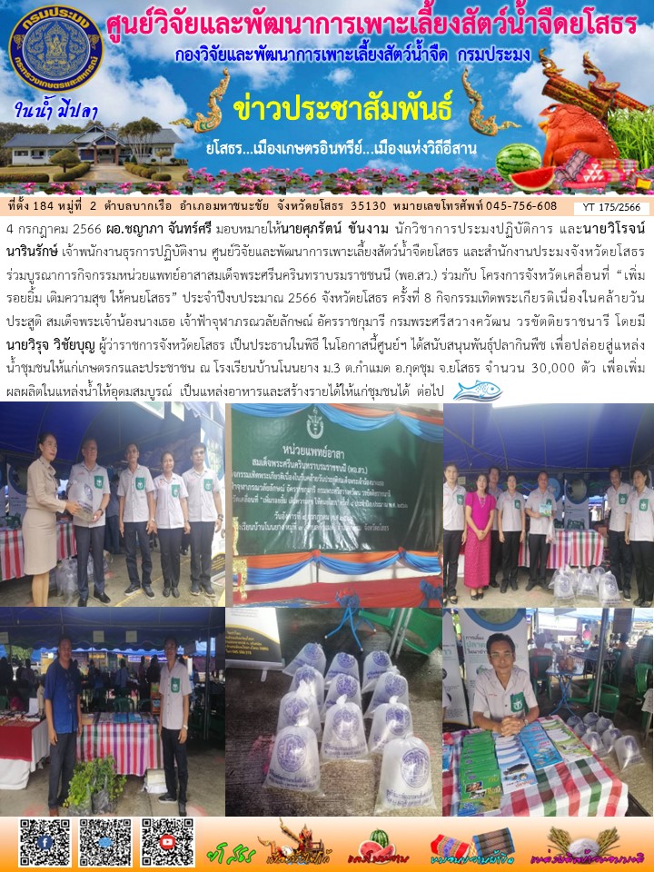 เจ้าหน้าที่ศูนย์วิจัยและพัฒนาการเพาะเลี้ยงสัตว์น้ำจืดยโสธร และสำนักงานประมงจังหวัดยโสธร ร่วมบูรณาการกิจกรรมหน่วยแพทย์อาสาสมเด็จพระศรีนครินทราบรมราชชนนี (พอ.สว.) ร่วมกับ โครงการจังหวัดเคลื่อนที่ “เพิ่มรอยยิ้ม เติมความสุข ให้คนยโสธร”