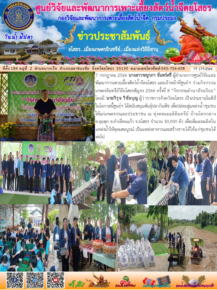 นางสาวชญาภา จันทร์ศรี ผู้อำนวยการศูนย์วิจัยและพัฒนาการเพาะเลี้ยงสัตว์น้ำจืดยโสธร และเจ้าหน้าที่ศูนย์ฯ ร่วมกิจกรรมเกษตรอินทรีย์วิถียโสธรสัญจร 2566 ครั้งที่ 8 “กิจกรรมดำนาอัจฉริยะ”