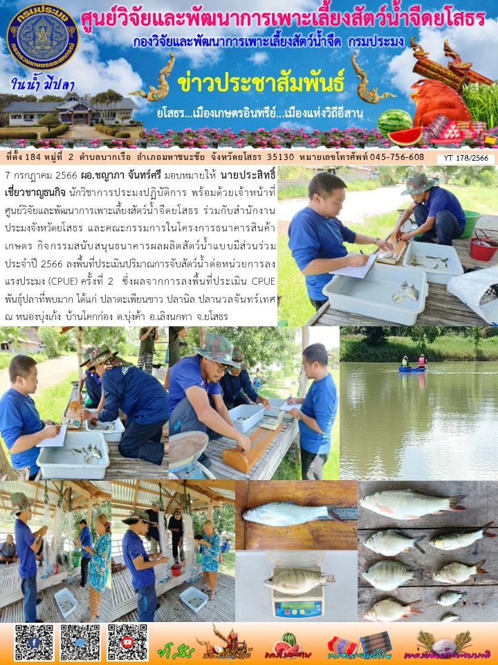 นายประสิทธิ์ เชี่ยวชาญธนกิจ นักวิชาการประมงปฏิบัติการ พร้อมด้วยเจ้าหน้าที่ศูนย์วิจัยและพัฒนาการเพาะเลี้ยงสัตว์น้ำจืดยโสธร ร่วมกับสำนักงานประมงจังหวัดยโสธร และคณะกรรมการในโครงการธนาคารสินค้าเกษตร กิจกรรมสนับสนุนธนาคารผลผลิตสัตว์น้ำแบบมีส่วนร่วม