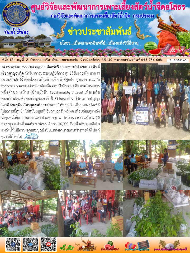 นายประสิทธิ์ เชี่ยวชาญธนกิจ นักวิชาการประมงปฏิบัติการ ศูนย์วิจัยและพัฒนาการเพาะเลี้ยงสัตว์น้ำจืดยโสธร พร้อมด้วยเจ้าหน้าที่ศูนย์ฯ บูรณาการร่วมกับส่วนราชการ และองค์กรส่วนท้องถิ่น มอบปัจจัยการผลิตตามโครงการหนึ่งตำบล หนึ่งหมู่บ้านยั่งยืน