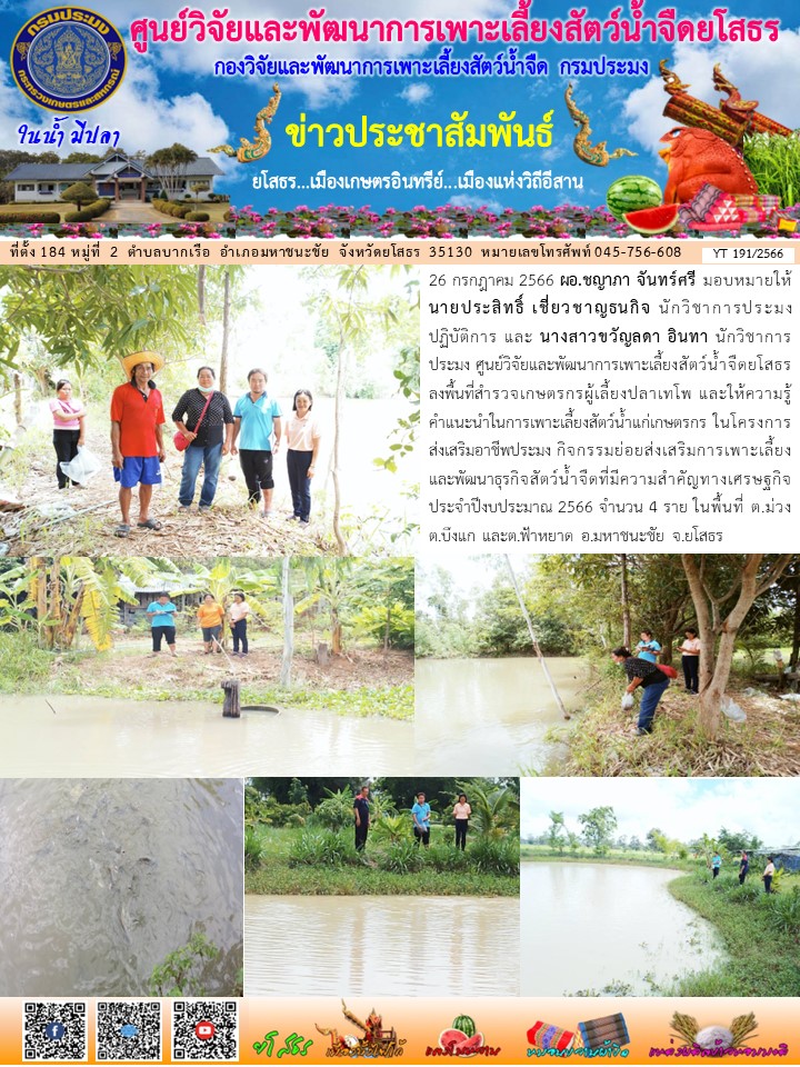 เจ้าหน้าที่ศพจ.ยโสธร ลงพื้นที่สำรวจเกษตรกรผู้เลี้ยงปลาเทโพ และให้ความรู้ คำแนะนำในการเพาะเลี้ยงสัตว์น้ำแก่เกษตรกร ในโครงการส่งเสริมอาชีพประมง กิจกรรมย่อยส่งเสริมการเพาะเลี้ยงและพัฒนาธุรกิจสัตว์น้ำจืดที่มีความสำคัญทางเศรษฐกิจ ประจำปีงบประมาณ 2566