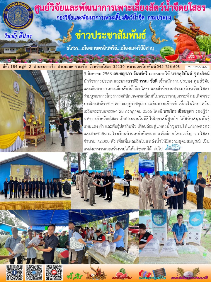 เจ้าหน้าที่ศูนย์วิจัยและพัฒนาการเพาะเลี้ยงสัตว์น้ำจืดยโสธร และสำนักงานประมงจังหวัดยโสธร ร่วมบูรณาการโครงการคลินิกเกษตรเคลื่อนที่ในพระราชานุเคราะห์ สมเด็จพระบรมโอรสาธิราช ฯ สยามมกุฎราชกุมาร เฉลิมพระเกียรติ เนื่องในโอกาสวันเฉลิมพระชนมพรรษา 28 ก.ค. 2566