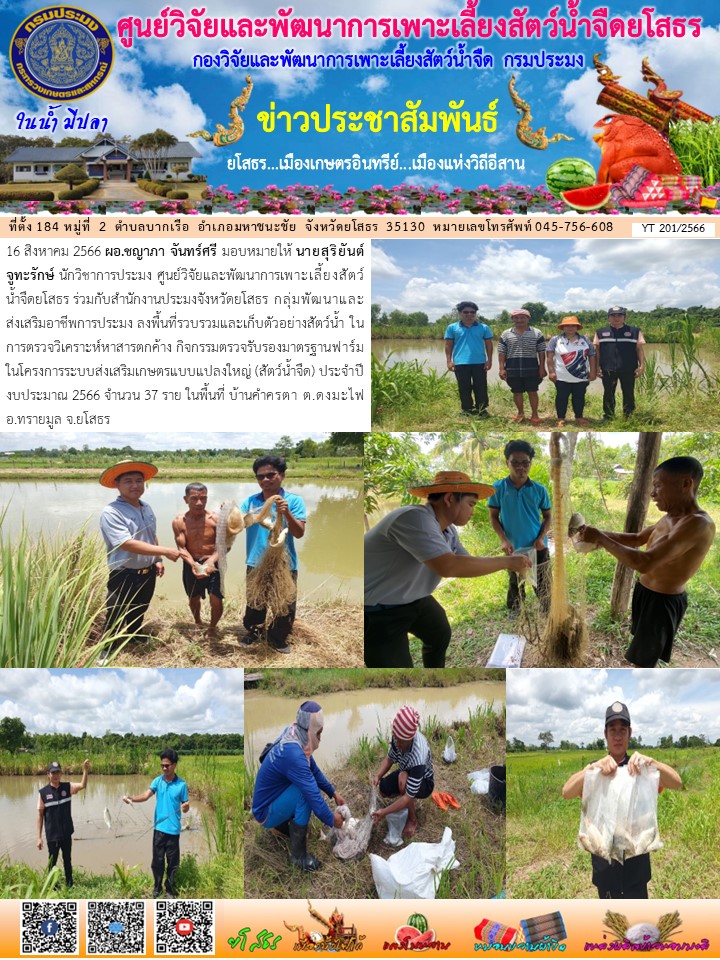 เจ้าหน้าที่ศูนย์วิจัยและพัฒนาการเพาะเลี้ยงสัตว์น้ำจืดยโสธร ร่วมกับสนง.ปจ.ยโสธร ลงพื้นที่รวบรวมและเก็บตัวอย่างสัตว์น้ำ ในการตรวจวิเคราะห์หาสารตกค้าง กิจกรรมตรวจรับรองมาตรฐานฟาร์ม ในโครงการระบบส่งเสริมเกษตรแบบแปลงใหญ่ (สัตว์น้ำจืด) ประจำปีงบประมาณ 2566