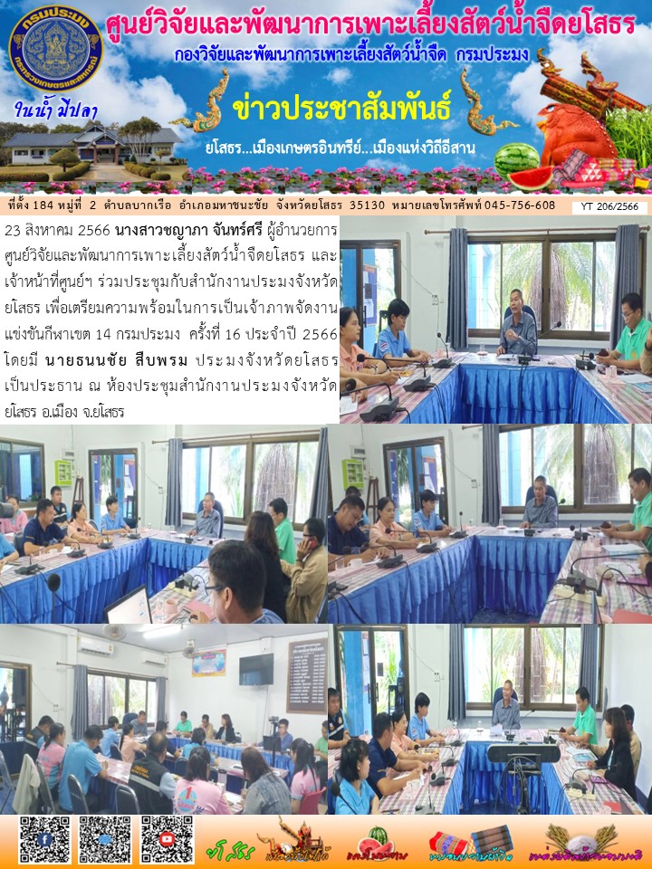 นางสาวชญาภา จันทร์ศรี ผู้อำนวยการศูนย์วิจัยและพัฒนาการเพาะเลี้ยงสัตว์น้ำจืดยโสธร และเจ้าหน้าที่ศูนย์ฯ ร่วมประชุมกับสำนักงานประมงจังหวัดยโสธร เพื่อเตรียมความพร้อมในการเป็นเจ้าภาพจัดงานแข่งขันกีฬาเขต 14 กรมประมง ครั้งที่ 16 ประจำปี 2566